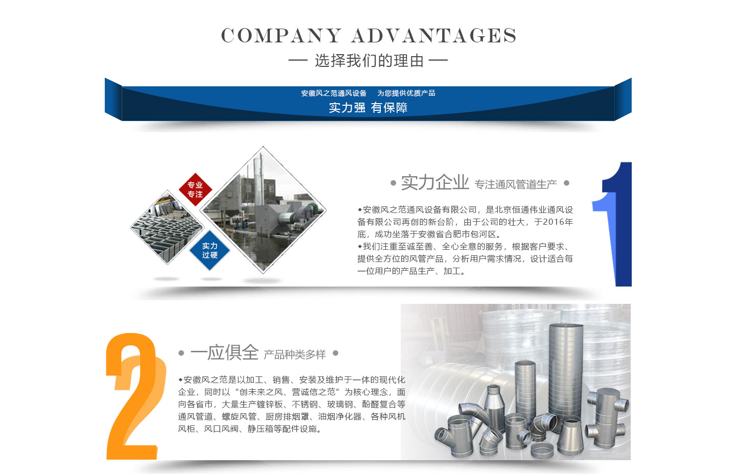 安徽風之范通風設備有限公司,是北京恒通偉業通風設備有限公司再創的新臺階,多年來,公司員工憑著“誠信敬業、團結拼搏、勇于開拓、務實進取”的企業精神,先后承接了多項重點工程項目,使公司健康穩步發展?,F由于公司的壯大,業務的拓展,又于2016年底,成功坐落于安徽省合肥市包河區。本公司生產設備精良,技術力量雄厚,質保體系完善!讓用戶體驗到,貼心的服務,無憂的售后!風之范是以加工、銷售、安裝及維護于一體的現代化企業,同時以“創未來之風、營誠信之范”為核心理念,面向全國各省市,大量生產鍍鋅板、不銹鋼、玻璃鋼、酚醛復合等通風管道、螺旋風管、廚房排煙罩、油煙凈化器、各種風機風柜、風口風閥、靜壓箱等配件設施。廣泛承接商場、工廠、酒店、寫字樓、地下室等,消防排煙工程、除塵凈化工程、室內通風工程、暖通空調工程、廚房排煙凈化工程。我們力求上進,追求,歡迎各界人士技術指導,經濟合作,共創美好明天!